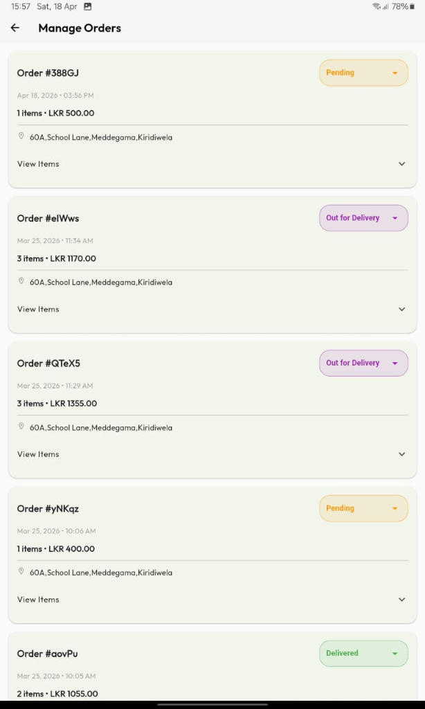 - Status Updates: Preparing, Out for Delivery, Delivered, and Cancelled states.